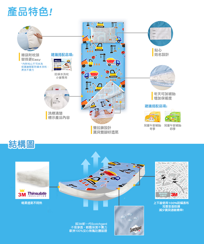 Filtrete防蟎睡袋系列採3M新一代Scotchgard保潔設計,觸感輕柔舒適、透氣不悶熱及永久防蟎保證的貼心設計,讓孩童得到最好的睡眠品質。